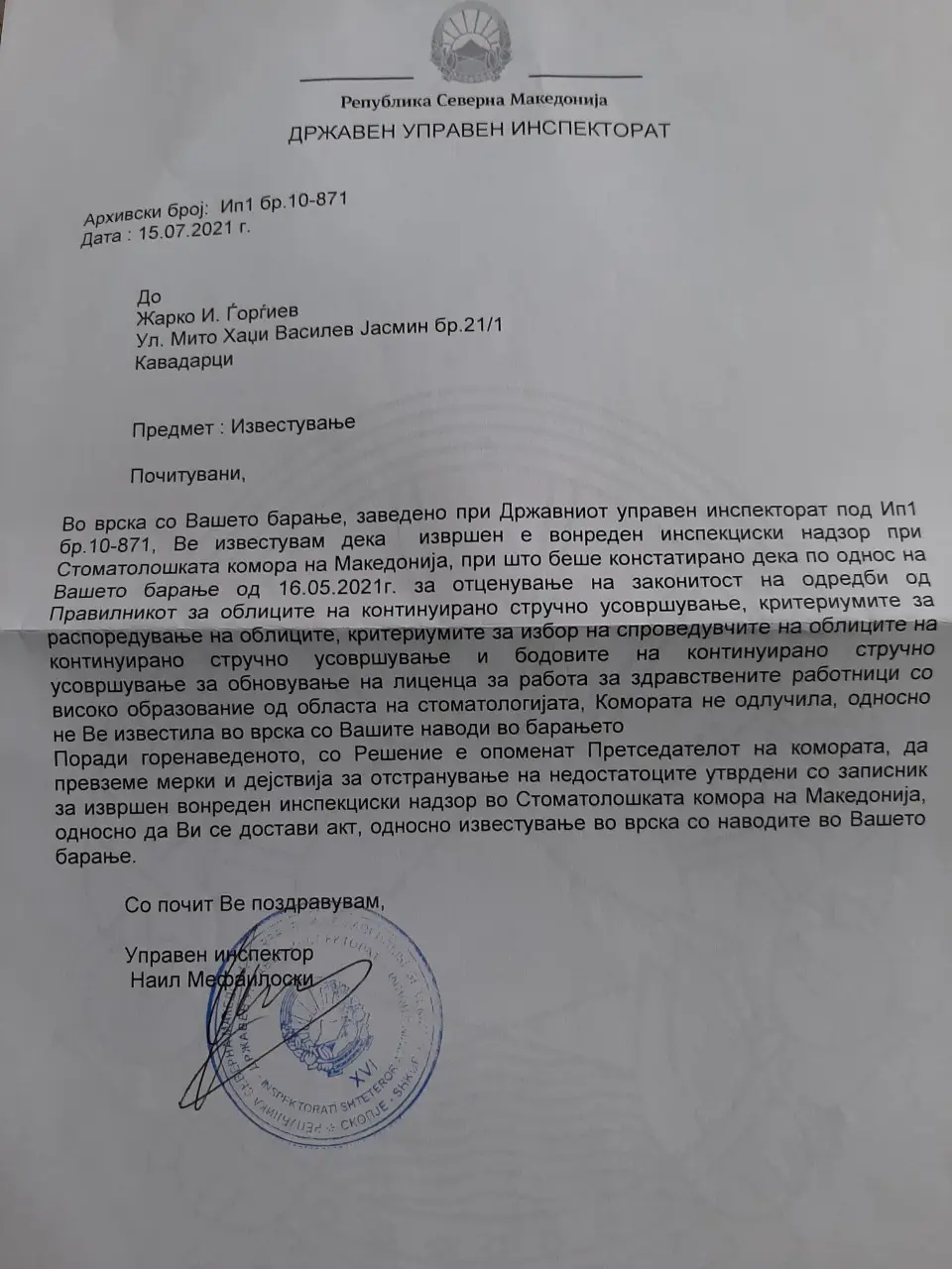 Барање за проверка на законитоста на работата на Стоматолошка Комора на Македонија во делот од јавните овластувања